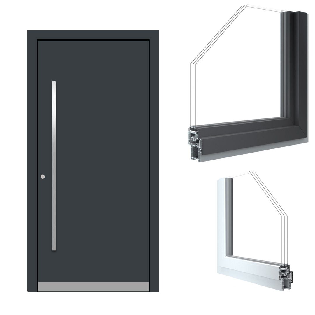 Fenster außen Kunststoff in Dekor RAL 7016, innen Kunststoff weiß (innen und außen flächenversetzt); Haustür Alu in RAL 7016 mit Glas-Seitenteil;
