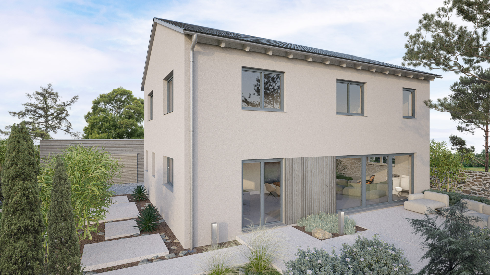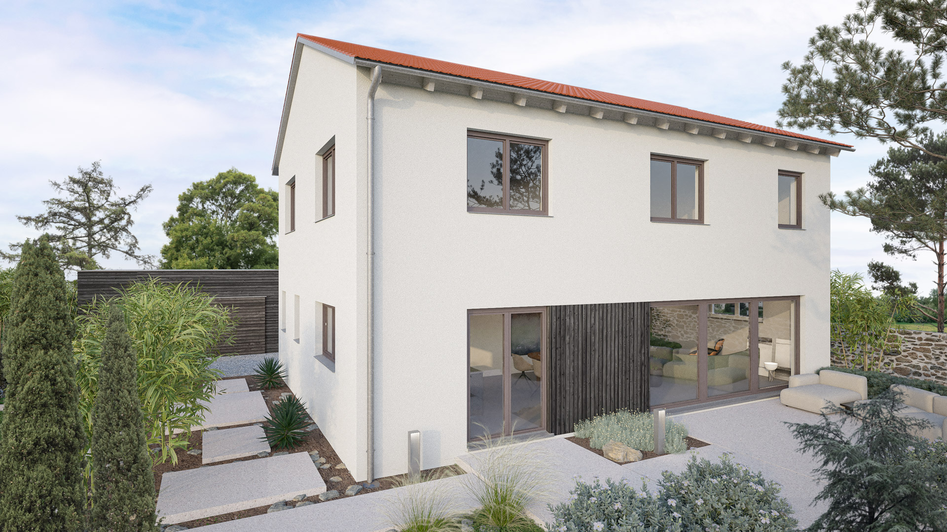 Wir haben drei wunderbare Farbkonzepte zusammengestellt. Das Haus ist generell verputzt und an der Terrasse haben wir die Fenster mit Holzelementen optisch zu einem Fensterband verbunden bzw. mit Besenstrichputz bei der Bauweise Stein auf Stein. Noch wenige Schritte und du wirst sehen, wie das Haus mit deiner Auswahl aussieht. Und keine Angst: du kannst deine Auswahl jederzeit ändern.