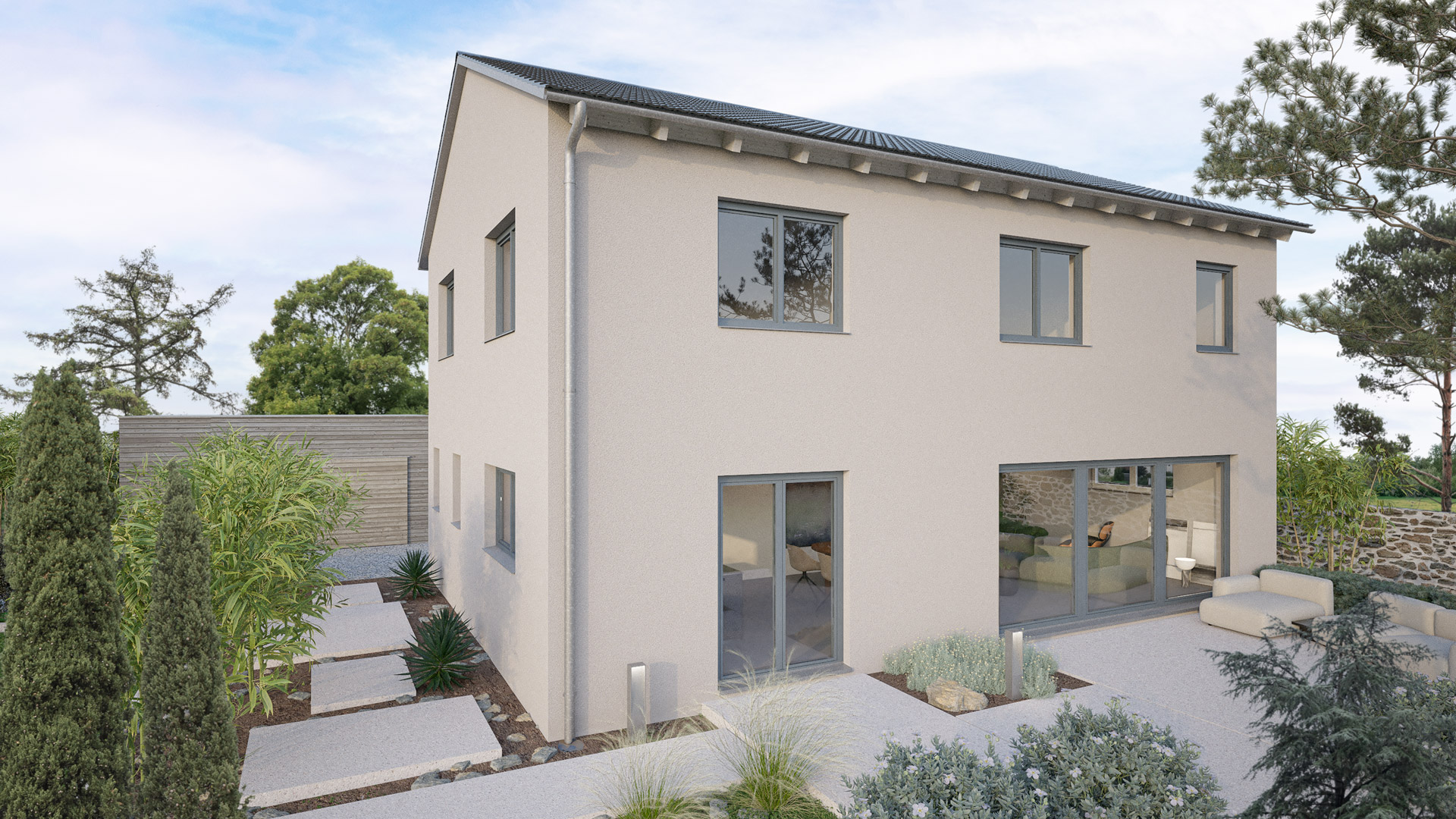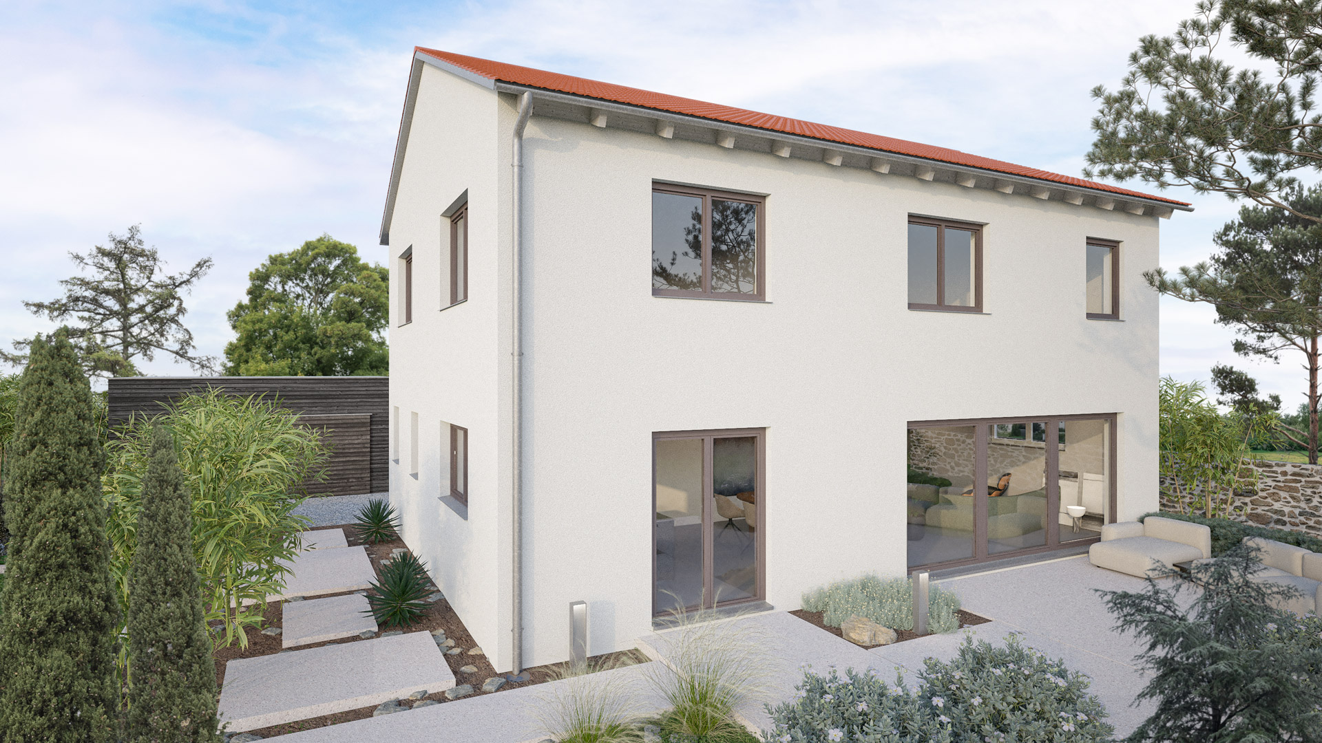 Bitte beachte, dass die Abbildung dein Haus ggf. mit Extras zeigt (hier: Mauern zur Einfriedung, Bepflanzung, Terrasse, Schuppen in der Einfahrt etc.). Der Preis bezieht sich exklusiv auf das Haus mit Bodenplatte oder Keller und die dazugehörigen Erdarbeiten.