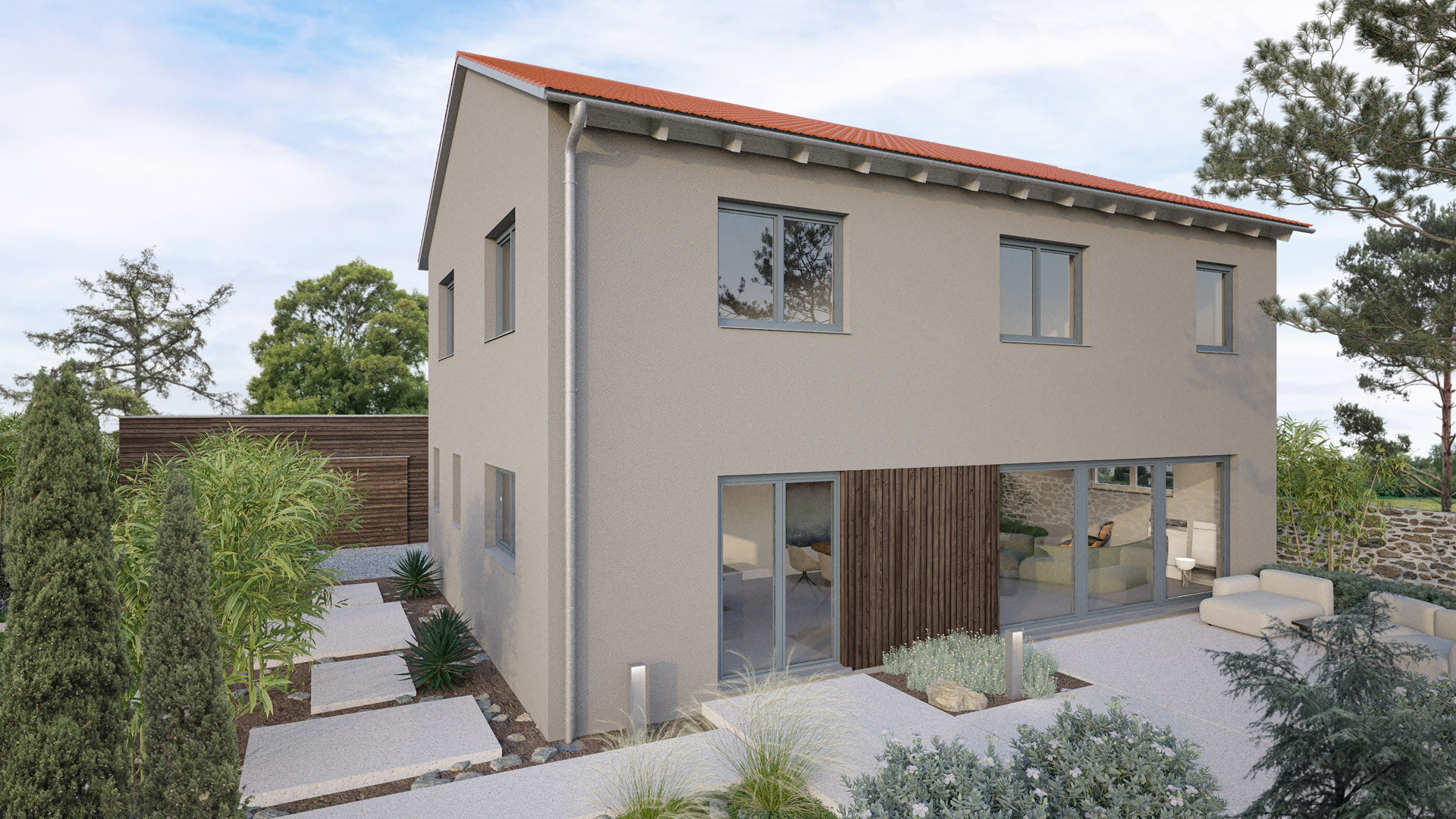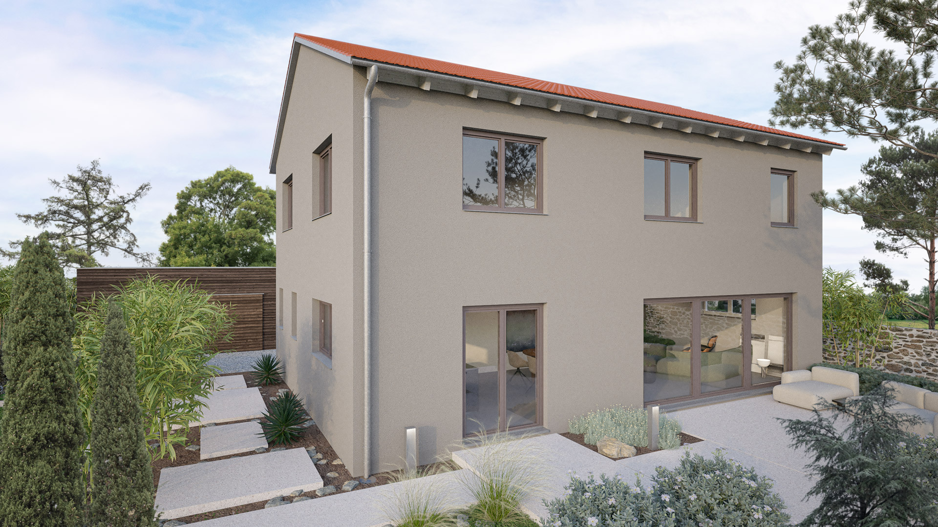 Deine konfigurierte Außenansicht des Hauses. Fassade taupe / Dacheindeckung rot / Fenster anthrazit