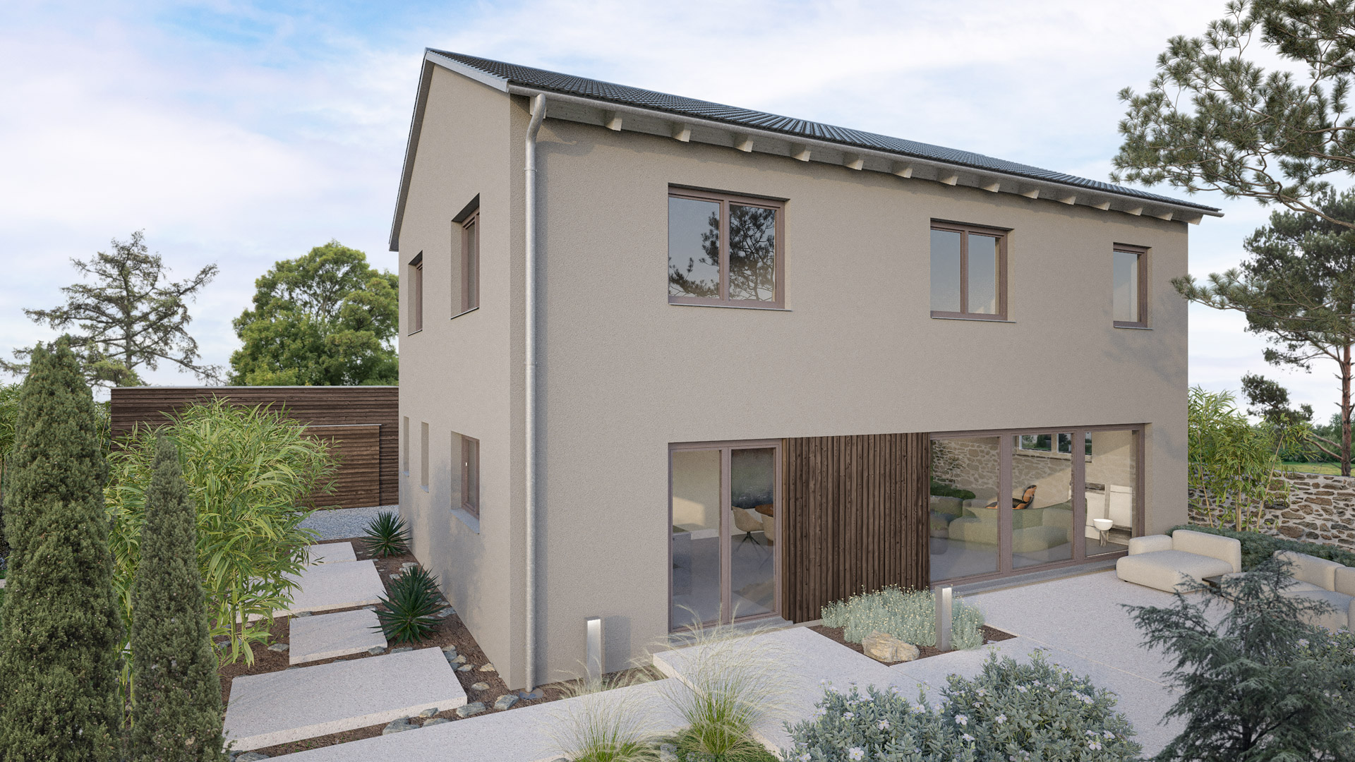 Deine konfigurierte Außenansicht des Hauses. Fassade taupe / Dacheindeckung anthrazit / Fenster graubraun