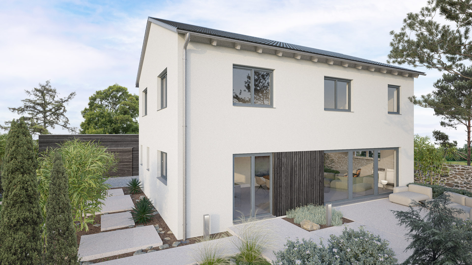 Verputz weiß, Holzelemente anthrazit