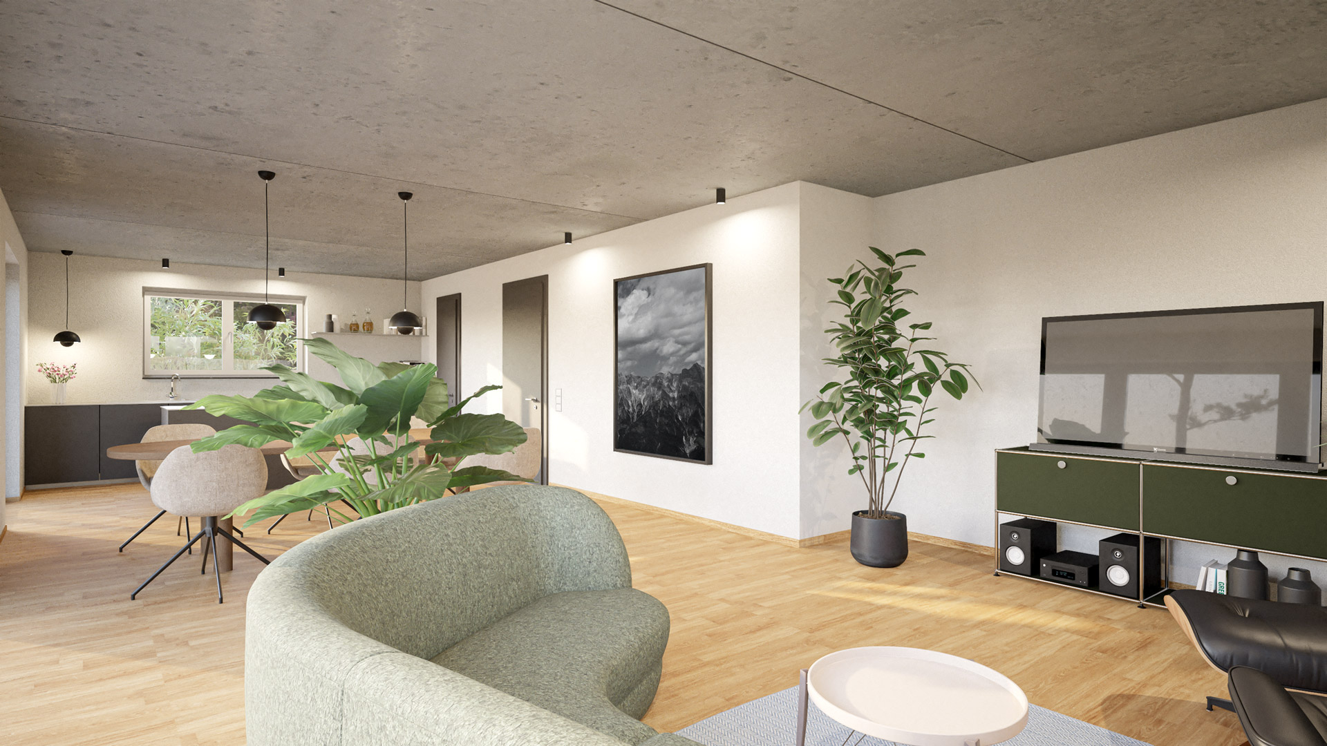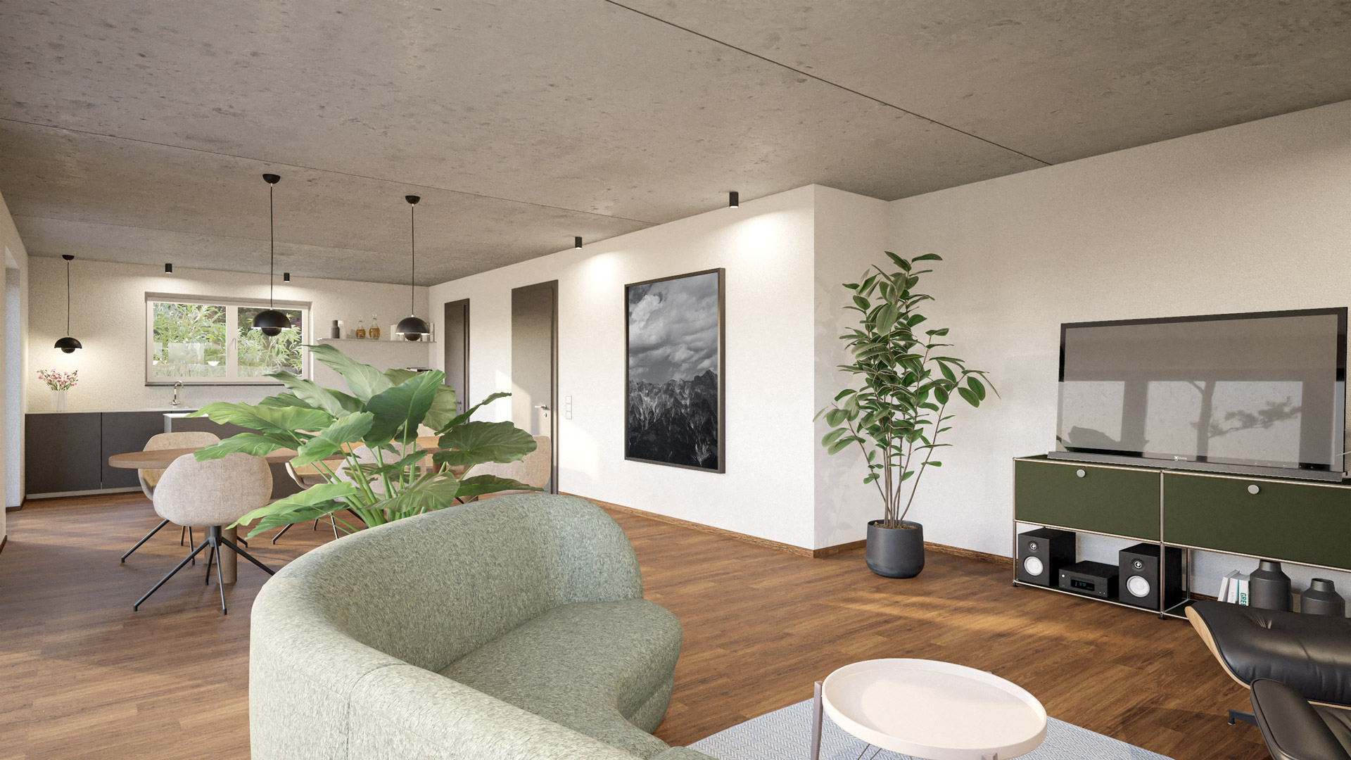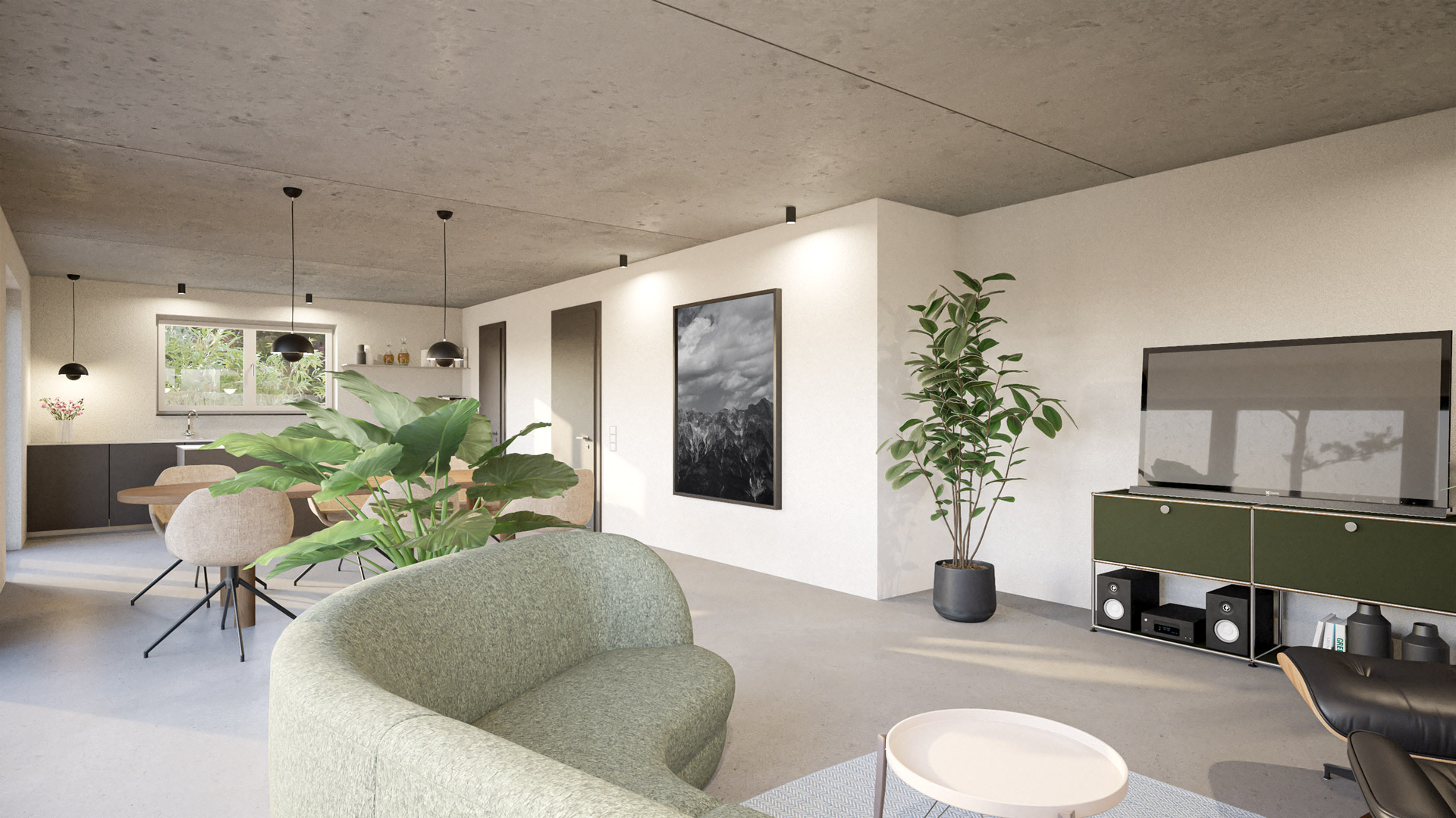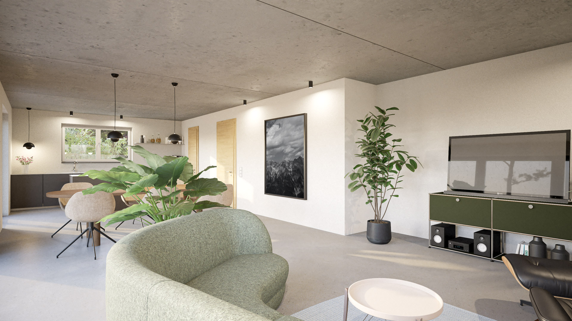 Deine konfigurierte Innenansicht des Hauses. Bodenbelag Sichtestrich / Innentüren CPL Ebony / Zwischendecke Sichtbeton