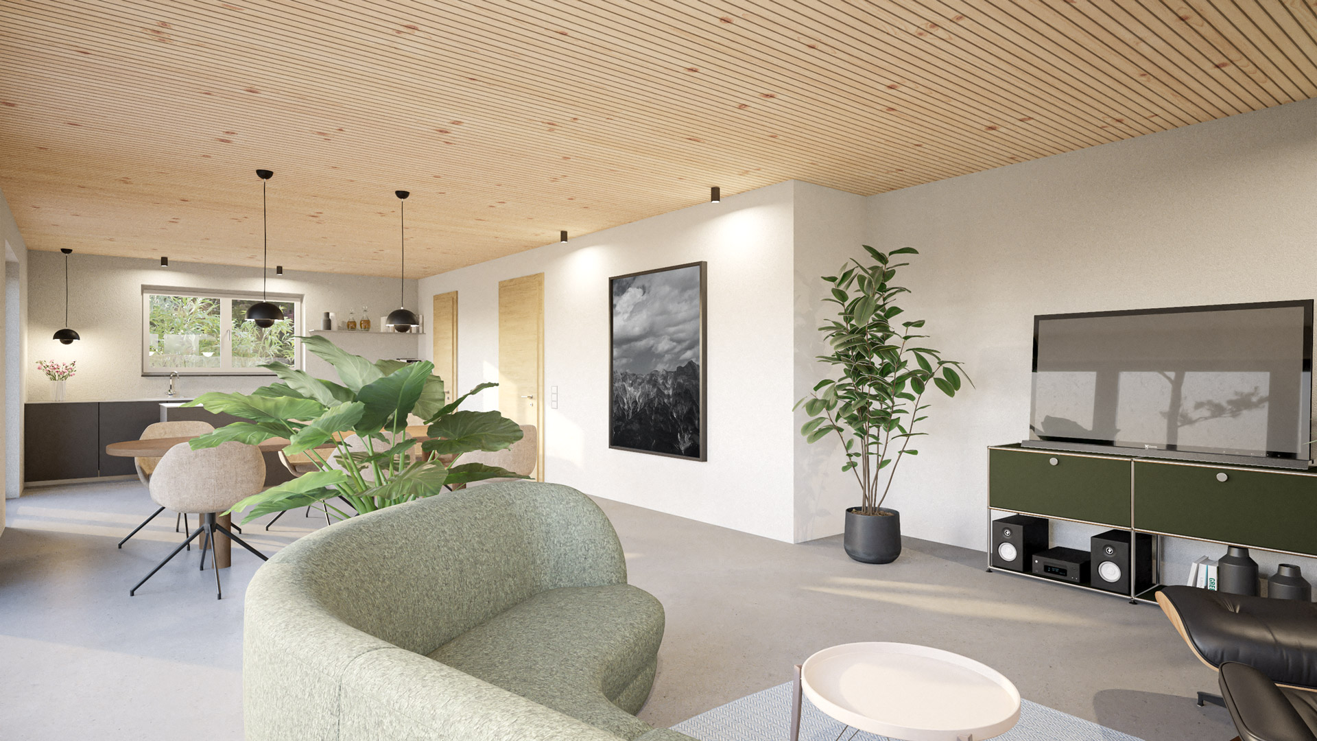 Deine konfigurierte Innenansicht des Hauses. Bodenbelag Sichtestrich / Innentüren weiß / Zwischendecke monoholz® Fichte (weitere Holzarten nach Absprache möglich)