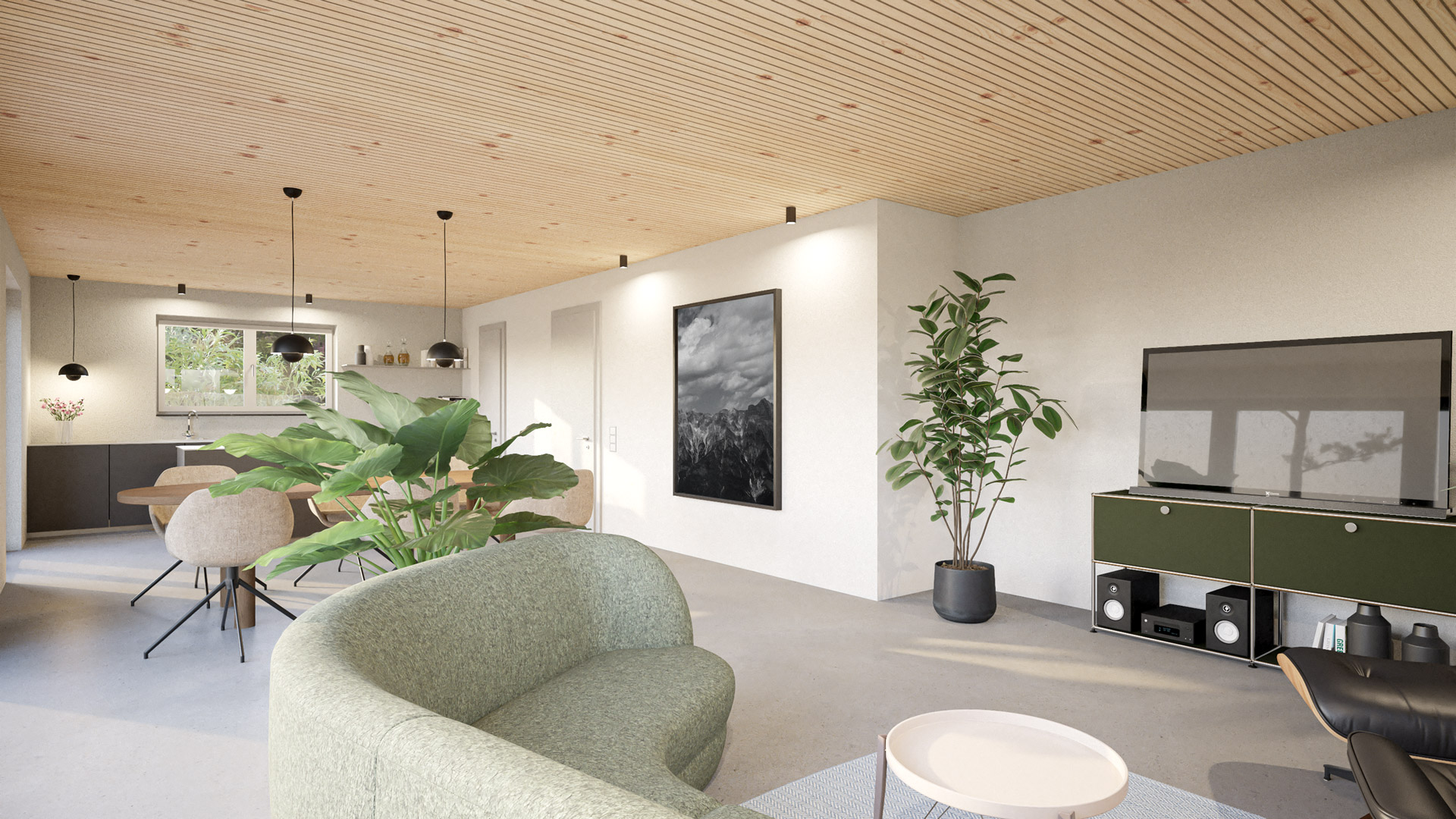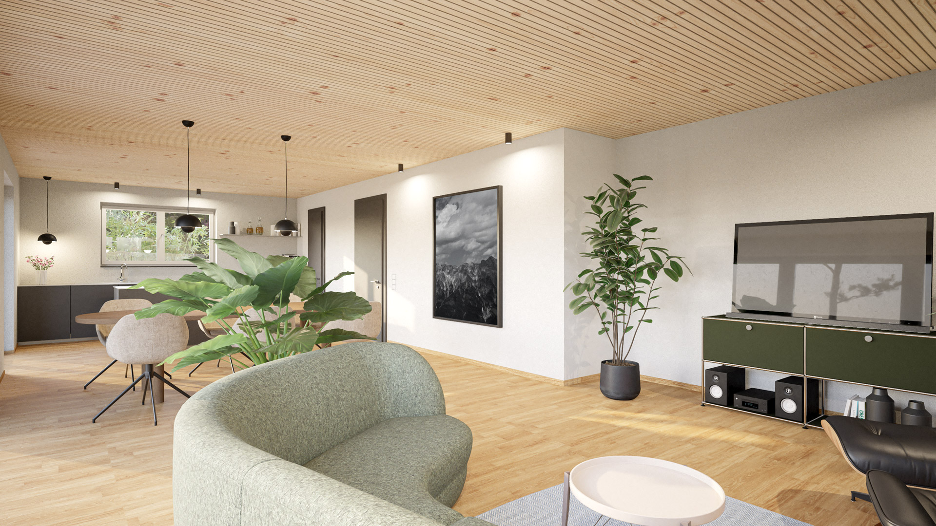 Deine konfigurierte Innenansicht des Hauses. Bodenbelag Sichtestrich / Innentüren CPL Eiche / Zwischendecke monoholz® Fichte (weitere Holzarten nach Absprache möglich)