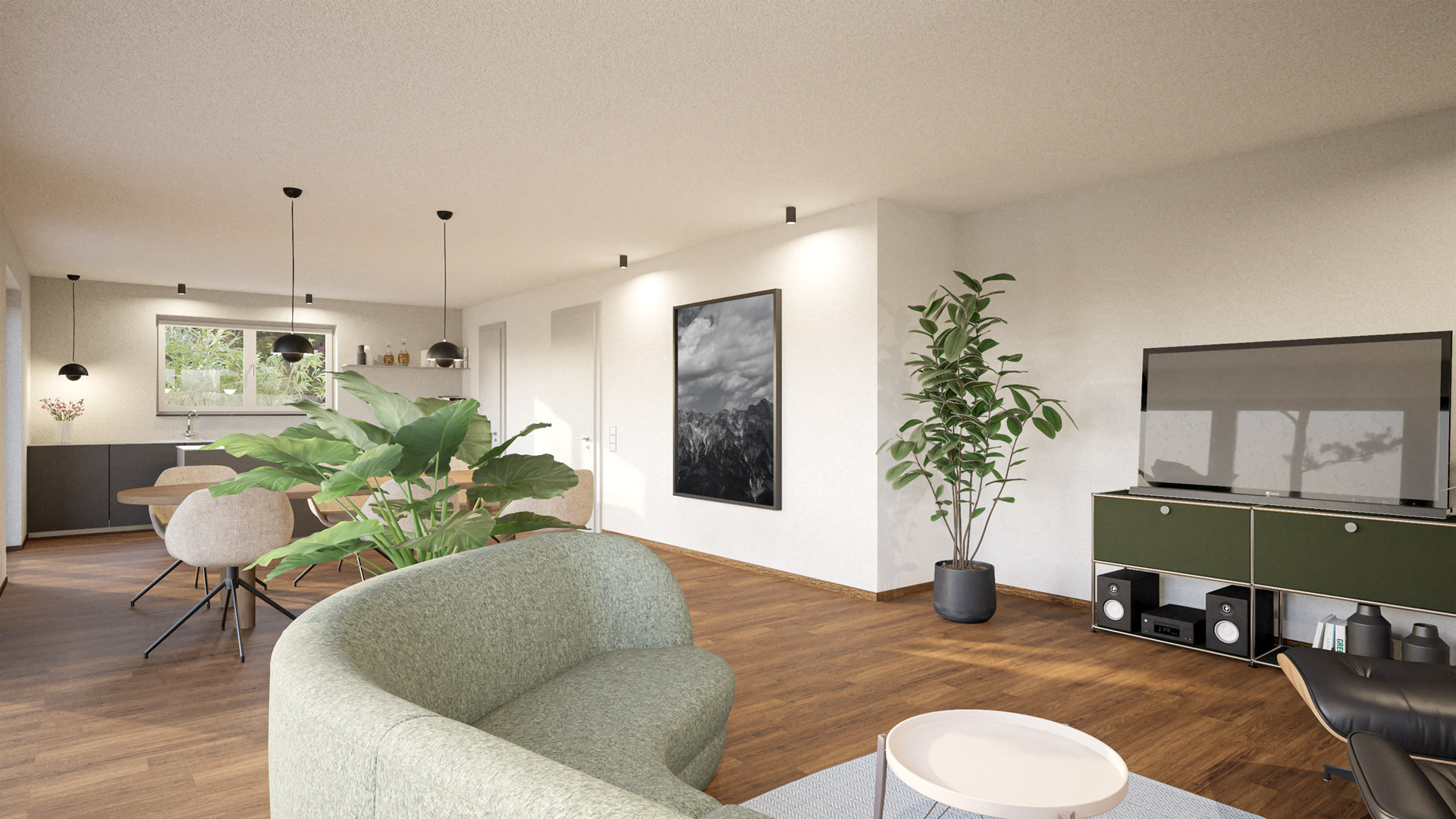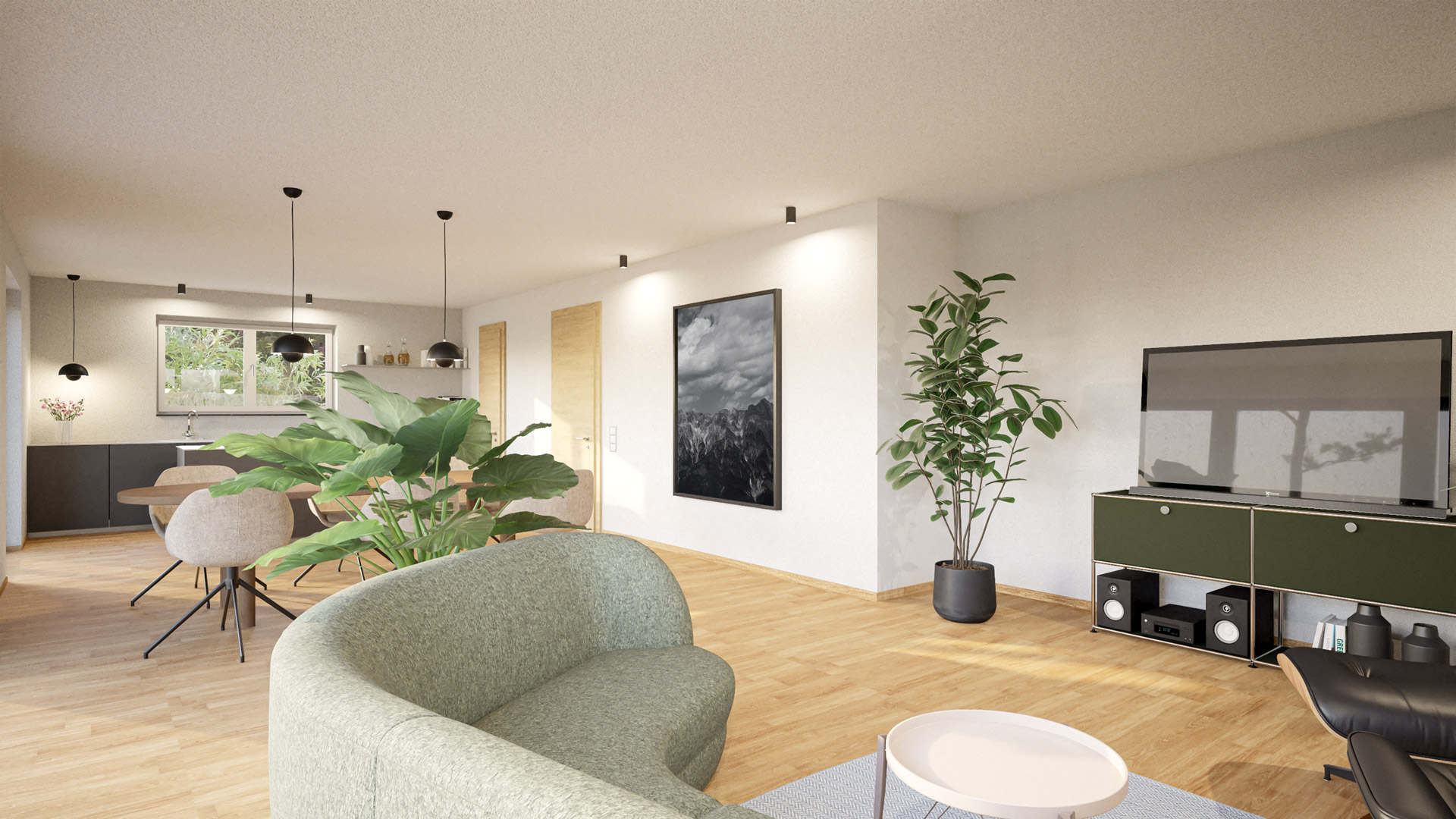 So sieht der Bereich Kochen-Essen-Wohnen mit deiner Auswahl aus. Möblierung und Küche etc. sind natürlich nicht Teil der Ausstattung. Auch hier gilt wieder: Wenn du etwas ändern möchtest, kein Problem. Navigiere einfach zurück oder nutze die Übersicht, um schneller zu navigieren und deine Auswahl anzupassen.
